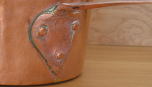 copper handle and copper rivets. As you can see from the photograghs the copper is folded to form the handle and is