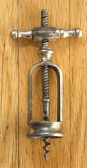corkscrew with threaded inner free turning shaft, turned wood handle and nickel-plated, early 1900s. Marked on both